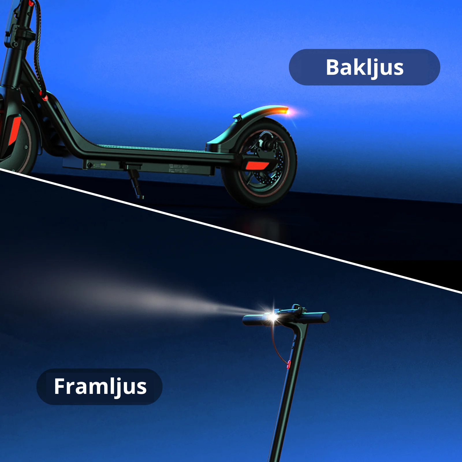 Säkert bromssystem: Utrustad med dubbelbroms (elektronisk + skivbroms) samt framlykta, bakljus och reflexer för att du ska synas tydligt, även i mörker.